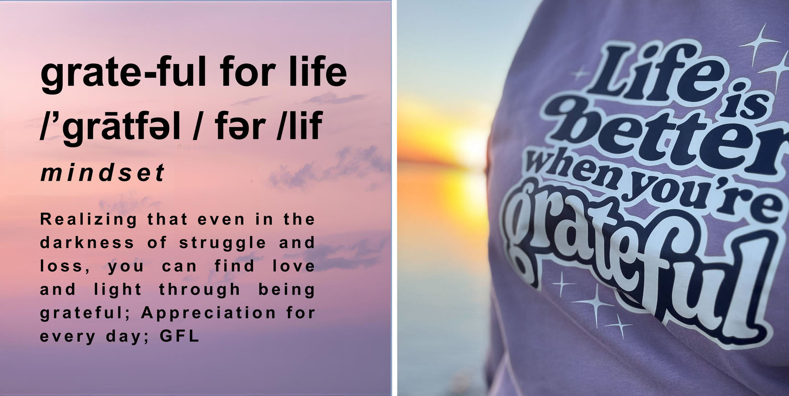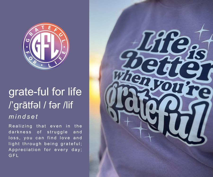 GFL is more than just a logo. Grateful for Life clothing inspires positive vibes and promotes feeling good. While we have all experienced something that has shaken our spirit, we move forward knowing that there is still so much to appreciate and that’s what GFL stands for. Wearing and sharing a GFL t-shirt, hat or hoodie helps remind us life is so much better when we are grateful.Â